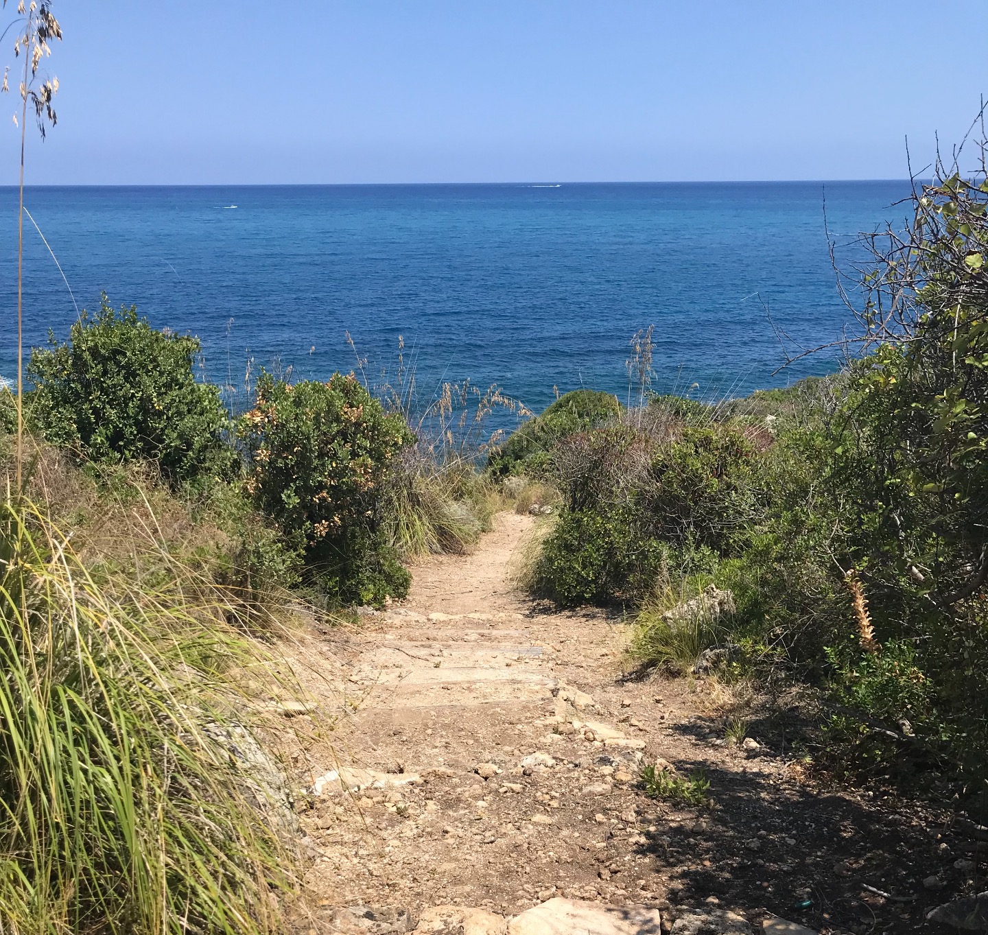 Un sentiero a più rampe conduce dalla piana degli ulivi millenari alle calette sottostanti. Si tratta di un sentiero in cui è possibile incontrare una vegetazione varia e folta e la tipica macchia macchia mediterranea. Attraversa zone boscose (all'ombra) e zone ricche di arbusti.